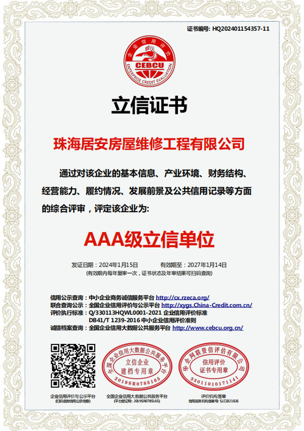 珠海居安房屋維修工程有限公司成立于2020年,是一家專注房屋維修的公司。我們擁有各類型專業(yè)人才,業(yè)務包括老舊建筑翻新改造、外墻空鼓修復、防水幕墻養(yǎng)護、外墻預置構件拆除更換、供排水管網(wǎng)改造、墻面翻新、鋼制結構建筑構建及折除,外墻清洗及裝修裝飾。 公司自成立以來,始終堅持以人為本、誠信敬業(yè)的經(jīng)營原則,與多家單位達成固定維修、養(yǎng)護清洗協(xié)儀,業(yè)務遍及廣州、東莞、中山、珠海等多個周邊城市。專業(yè)化團隊尤其在墻面及窗邊防水工程業(yè)內知名。…… >>> 更多內容 |